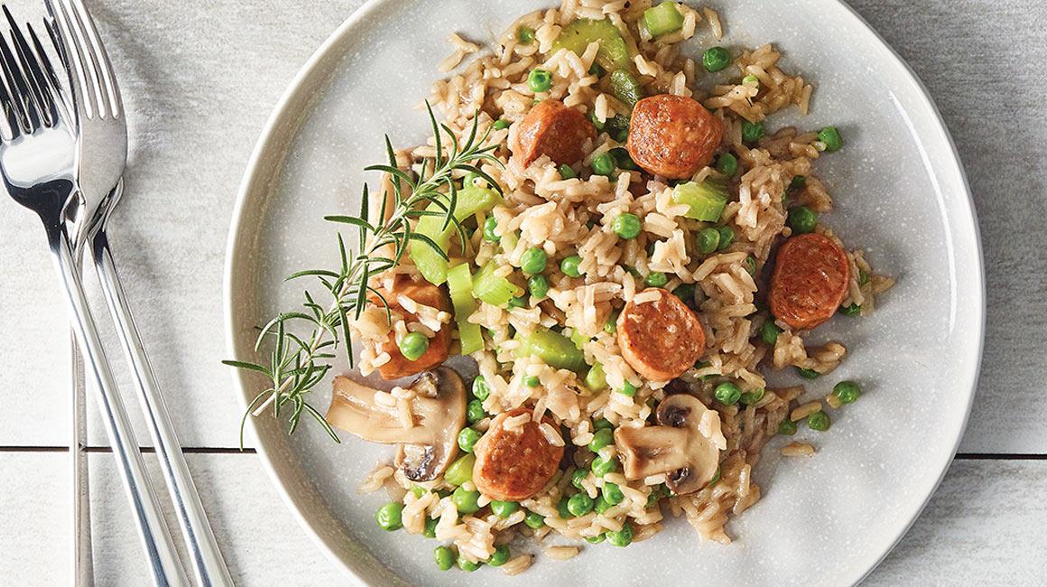 - 1. Faire dorer les saucisses et l'oignon dans une grande poêle antiadhésive à feu moyen. Ajouter le riz et poursuivre la cuisson 1 minute en brassant continuellement. Déglacer avec la bière et porter à ébullition.